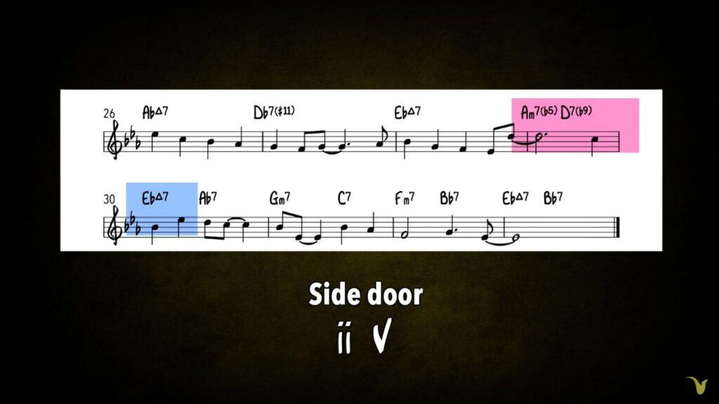 In the second A section, we have one more new harmonic building block. This is sometimes called the second back door, but I like to call it the side door.