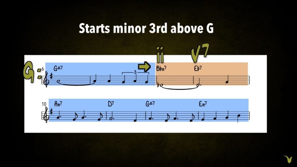 In bars 8 and 9, we have a new harmonic building block that I call the ii – V up a minor 3rd.