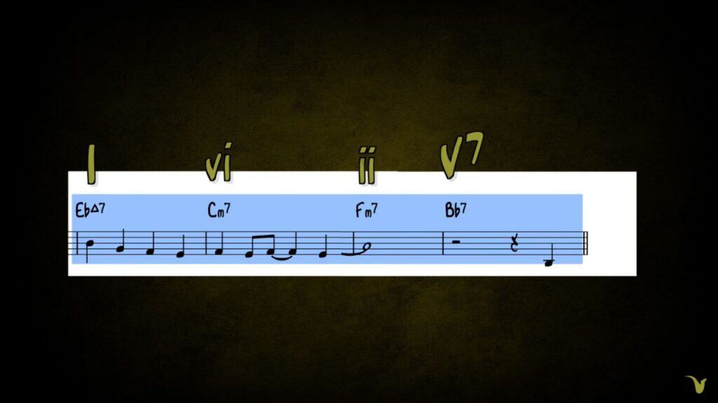 Now we’re back at the I chord followed by this vi. This is part of a larger harmonic building block that is extremely common: the I – vi – ii – V. It’s very much like our trusty ii – V – I, but with the addition of the vi chord.